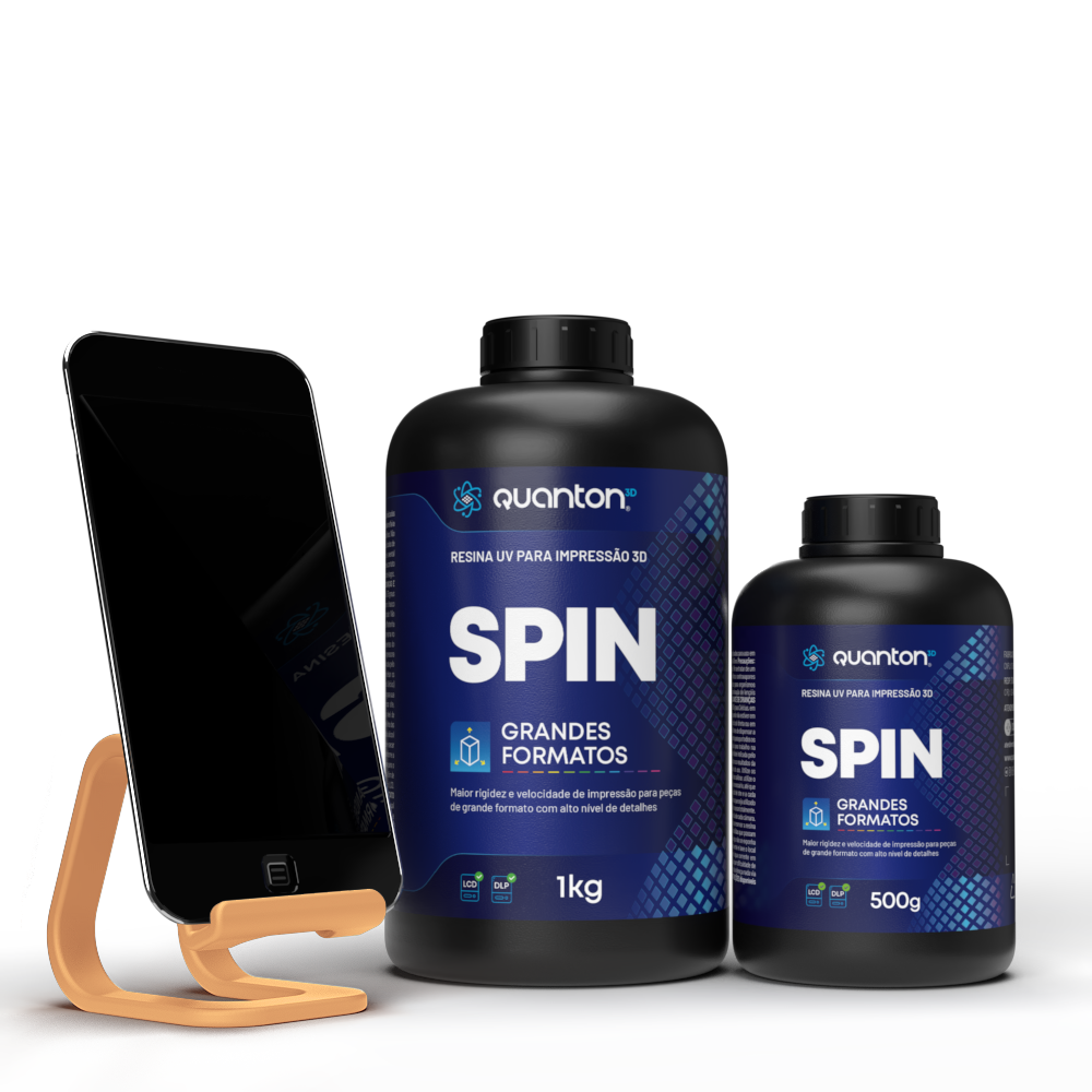 As Resinas Quanton3D são fotopolimerizáveis e projetadas para impressoras 3D LCD e DLP com comprimento de onda entre 395 – 405nm. A linha Spin oferece maior rigidez e leve flexibilidade com alto nível de detalhes. A resina Spin destaca-se por suas cores opacas e precisão, resistindo a deformações sob tensões. Recomenda-se o uso de EPIs no manuseio. É indicada para protótipos funcionais, peças de uso final, modelos detalhados e objetos decorativos que exigem precisão dimensional.